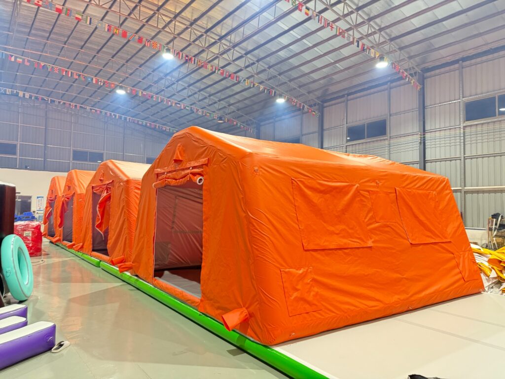 Rapid inflatable shelters supporting medical teams, evacuation zones and emergency response units in demanding field environments.